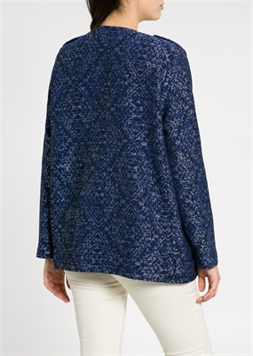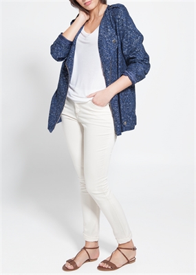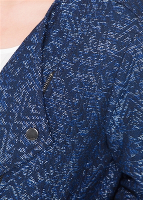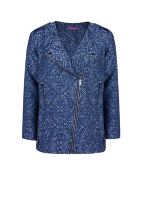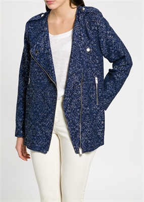 Abrigo biker en tejido jacquard confeccionado en una mezcla de algodón con detalles metalizados. Trabillas en los hombros, solapas con botón a presión y cierre de cremallera asimétrico en la parte delantera. Dos bolsillos de cremallera laterales y trabillas en la cintura.