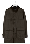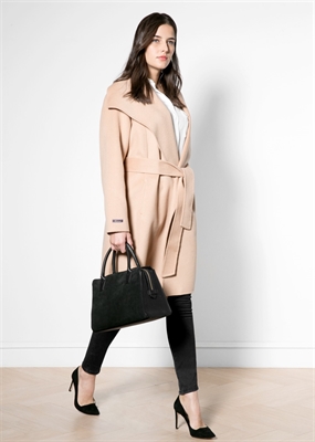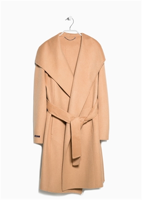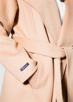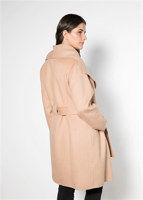 Abrigo envolvente hecho a mano en una mezcla de lana. Solapas amplias, cinturón desmontable y manga larga.