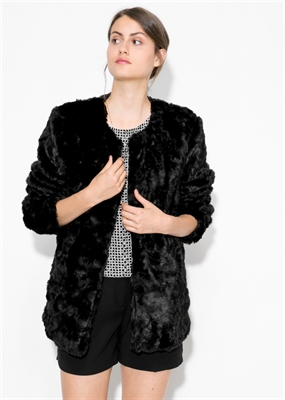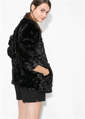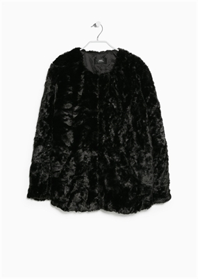 Abrigo de pelo con dos bolsillos laterales. Cuello redondo, manga larga y forro interior.