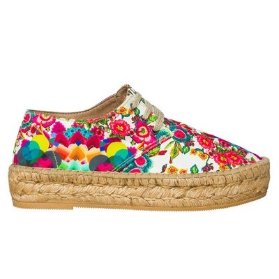 Unas alpargatas veraniegas y originales con print de flores y plataforma de esparto de 3cm. Están hechas en España cuidando los detalles para mimar tus pies.