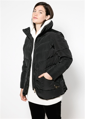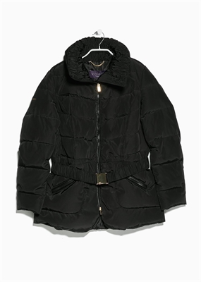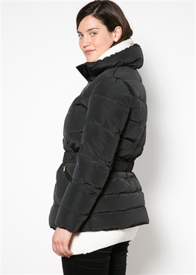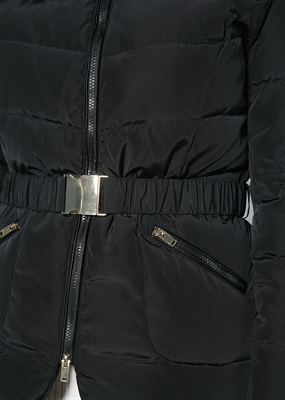 Anorak acolchado con relleno de plumas y plumón. Cuello chimenea, cierre de cremallera y ribetes en efecto piel. Cinturón elástico desmontable, manga larga con puños elásticos y dos bolsillos laterales de cremallera.