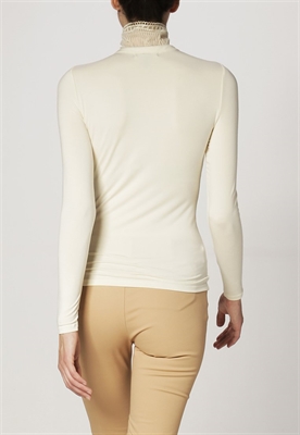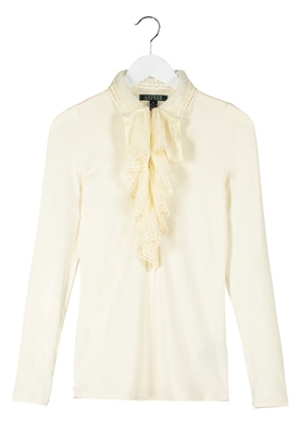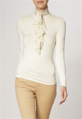 Largo:normalAjuste:ceñidosMaterial/composición:jersey, encajeModelo, altura:181 cmOcasión:celebraciónEstampado:unicolorLargo de la prenda:59 cmCuello:con volantesLargo de la manga:60 cmLargo de manga:manga largaMaterial exterior:96% viscosa, 4% elastanoCuidados:lavar a manoNúmero de artículo:L4221D05E-A11
