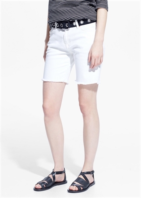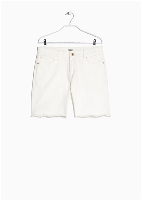 Bermudas denim en color blanco con terminaciones deshilachadas. Tiro medio, cinco bolsillos, trabillas, cierre de cremallera y botón.