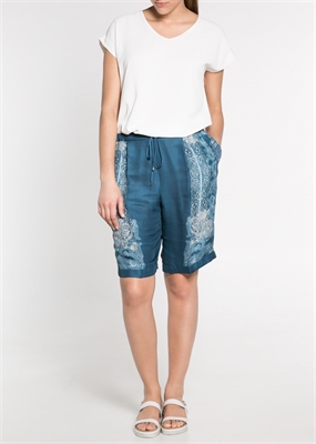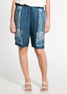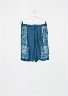 Bermudas en tejido satinado con estampado barroco y de cachemires. Cintura elástica con cordón para anudar y pinzas en la parte delantera. Dos bolsillos laterales, bolsillo de ribete decorativo en la parte posterior y bajo con vuelta.