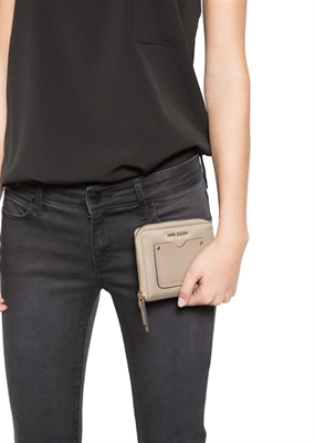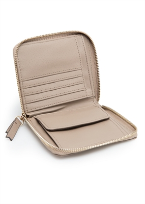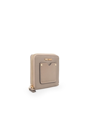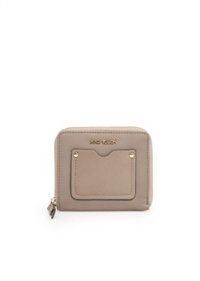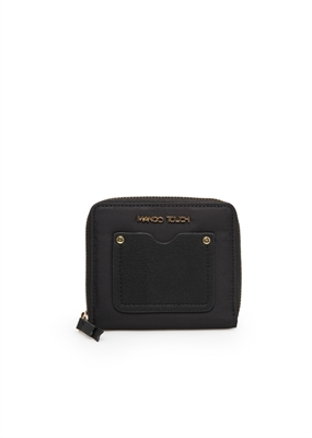 Billetera pequeña de nylon con bolsillo exterior en efecto piel abatanada y cierre de cremallera superior. Dos compartimentos interiores, múltiples ranuras para tarjetas y bolsillo interior de solapa.