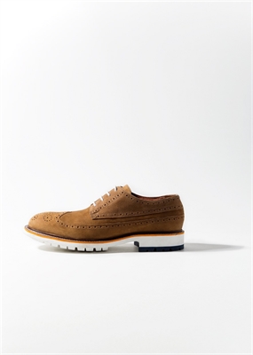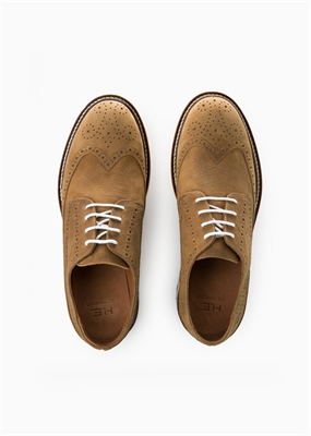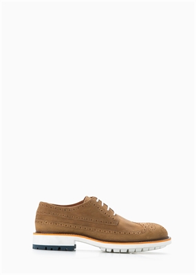 Blucher de serraje con picados, cierre de cordones y suela de goma en contraste.