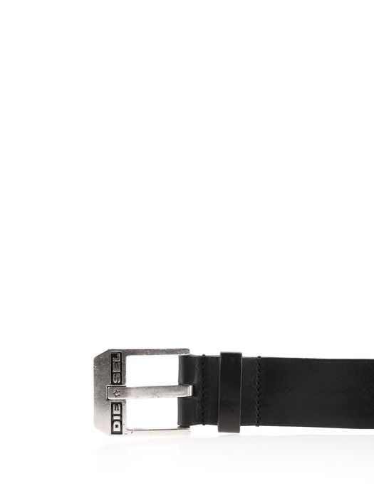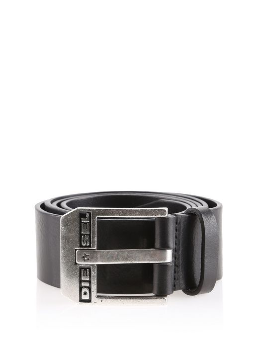 Belt, shiny treated leather, shiny treated leather, buckle fastening, metallic logo detail.