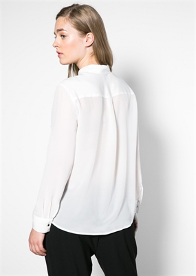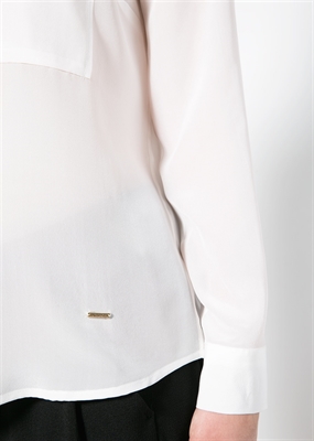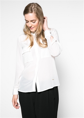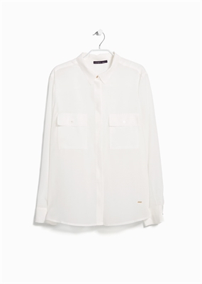 Blusa de seda con dos bolsillos de solapa en el pecho. Cierre de botones, manga larga y puños abotonados.