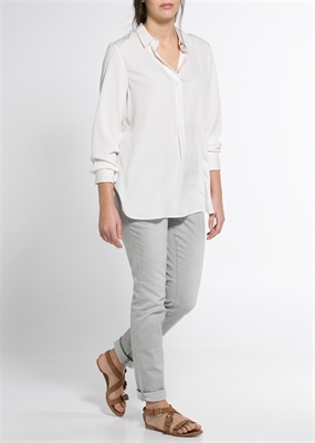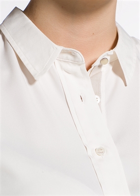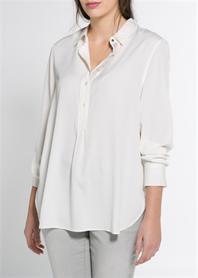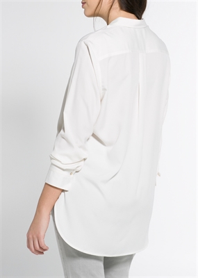 Blusón en tejido ligero con panel satinado en la parte posterior. Cierre de botones en la parte delantera, manga larga abotonada y bajo redondeado con aberturas laterales
