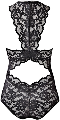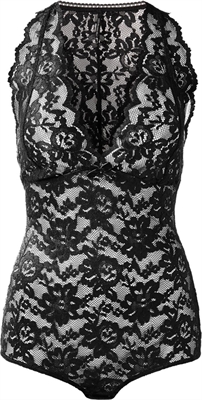 Body de tirantes totalmente realizado en encaje, con copas no acolchadas y sin varilla. Decorado con un lazo de terciopelo en el centro del busto y una abertura en la espalda, con cierre a presión.