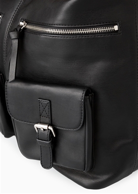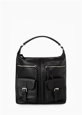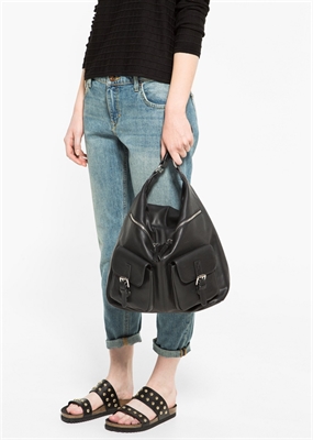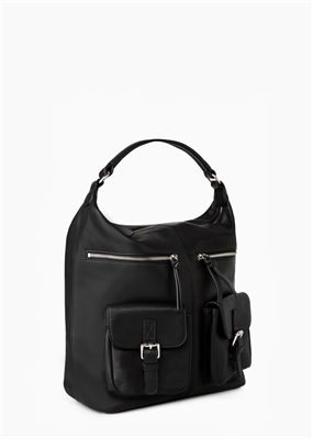 Bolso hobo en efecto piel con bolsillos de solapa y dos bolsillos de cremallera en la parte frontal. Asa corta, bolsillo interior y cierre de cremallera superior.