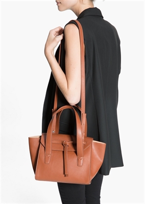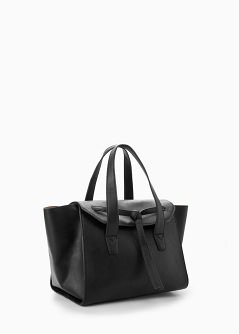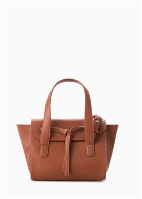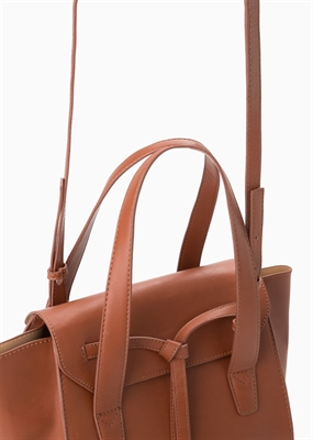 Bolso pequeño en efecto piel con detalle de nudo. Solapa con cierre de botón a presión, bolsillo interior, doble asa superior y asa larga desmontable.