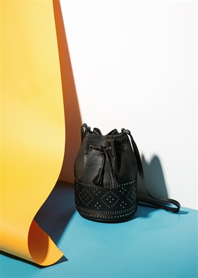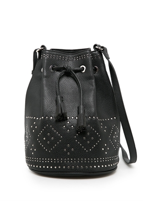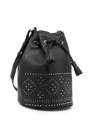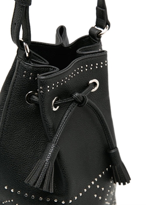 Bolso tipo saco en efecto piel abatanada con asa larga ajustable. Cierre de tiras para anudar y tachuelas decorativas.