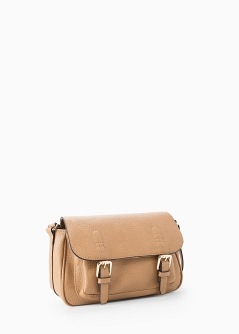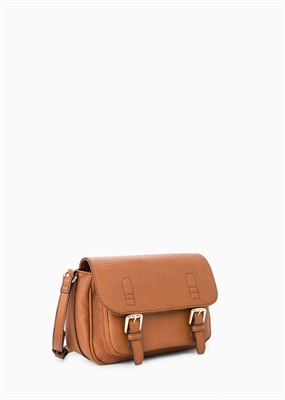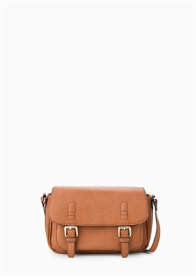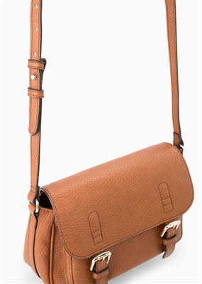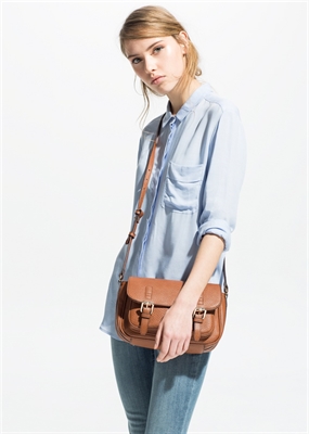 Bolso satchel pequeño con asa larga ajustable. Solapa con cierre de botones a presión y doble compartimento interior.