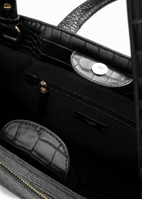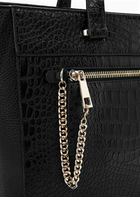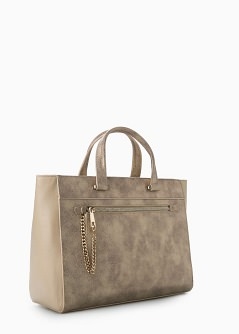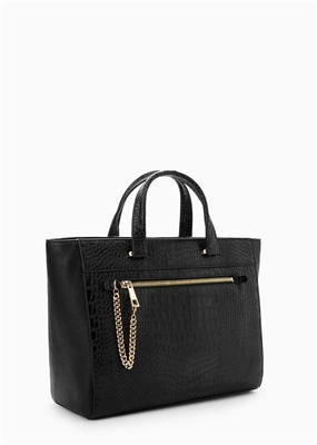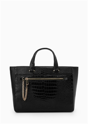 Bolso tote con efecto metalizado con bolsillo exterior de cremallera con cadena. Doble asa corta, asa larga, cierre magnético y bolsillo interior.