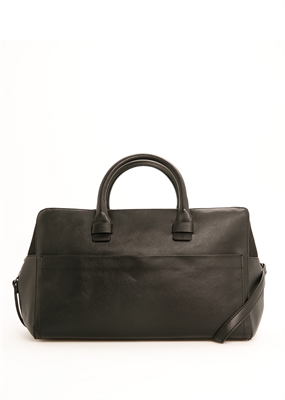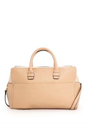 Bolso tote en efecto safiano con doble asa corta superior y asa larga desmontable. Bolsillo exterior con cierre de botón a presión, cierre de cremallera superior y bolsillos interiores.