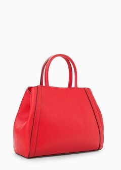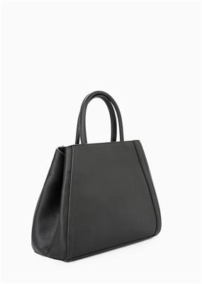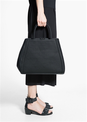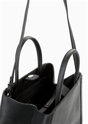 Bolso tote en efecto safiano con laterales en efecto piel abatanada, asa larga desmontable y doble asa corta. Cierre de botón a presión, tira interior ajustable y bolsillo interior.