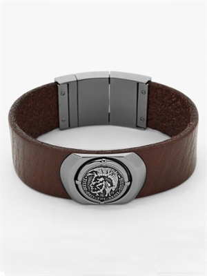 Featuring rich brown leather and a prominent Diesel logo, this cuff bracelet makes the perfect addition to your wardrobe.Details: Polished GunmetalMeasurements: Length 18.5 cmMaterial: Stainless Steel and LeatherClosure: Box Clasp