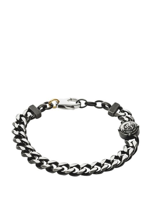 Black stainless steel chain links and oversized hardware give an industrial feel to this Diesel bracelet.Material: Stainless SteelClosure: Lobster ClawFinish: Gunmetal Tone, Tumbled Black IPMeasurements: 18 cm length, 1.5 cm extension