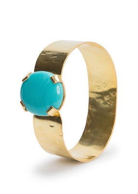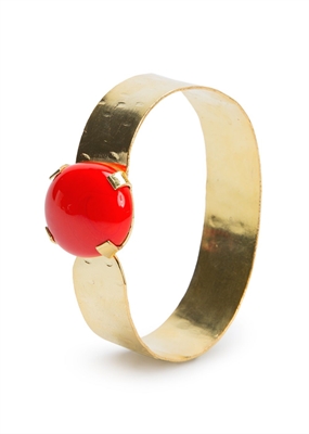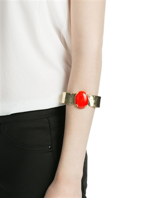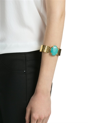 Brazalete metálico con acabado martillado y piedra central en contraste.