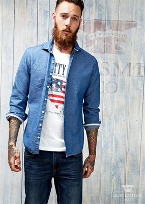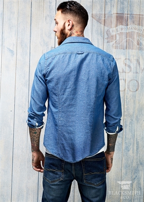 Camisa en chambray de algodón con diseño de lunares que pertenece a la colección Blacksmith. Cuello clásico, cierre de botones en la parte delantera, manga larga y puño redondeado con cierre de un botón.