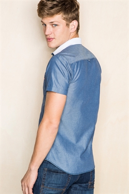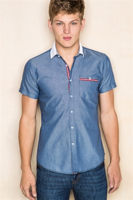 Camisa de manga corta, abotonada al frente, con bolsillo en el pecho y detalle de rayas en dos colores.