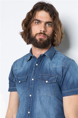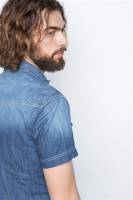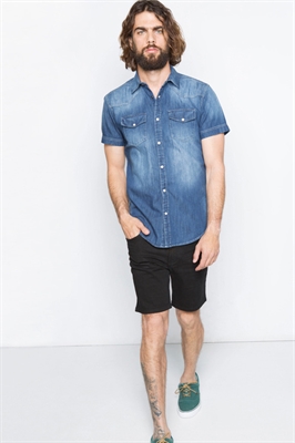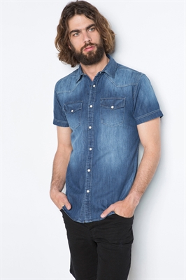 Camisa denim manga corta, dos bolsillos con tapeta y botón.