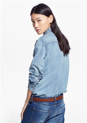 Camisa slim-fit denim con lavado claro. Dos bolsillos de solapa en el pecho, cierre de botones a presión en la parte delantera, manga larga y puños abotonados.