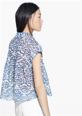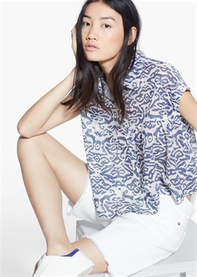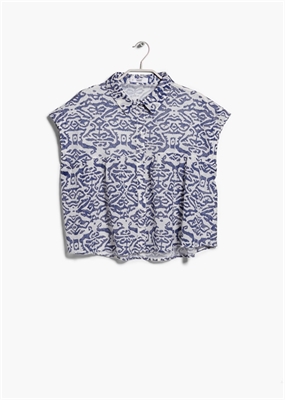Camisa estampada con textura confeccionada en una mezcla de algodón. Manga corta, detalle fruncido en el pecho y cierre de botones en la parte delantera.