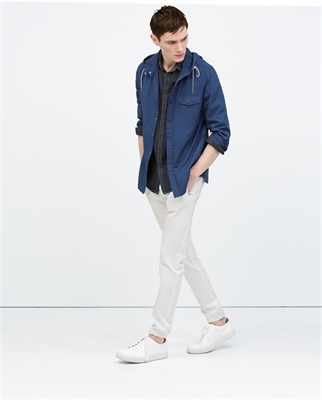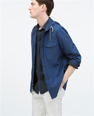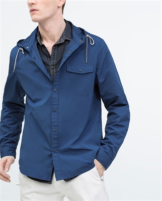 Camisa nylon lisa con capucha. Bolsillo frontal y dos laterales. Cierre a presión Altura modelo: 189 cm. Talla L