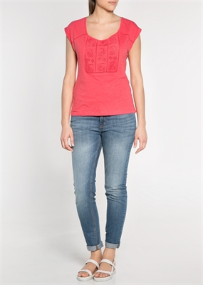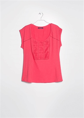 Camiseta de algodón flamé con bordado suizo en la parte delantera. Escote redondo, ribetes calados y manga corta con vuelta.