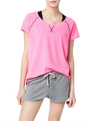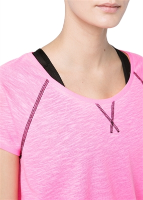 Camiseta de yoga en algodón flamé con escote redondo y manga corta raglán. Confeccionada en un tejido transpirable de fibra natural que proporciona comodidad y libertad de movimiento. Costuras en contraste y bajo asimétrico con aberturas laterales. Prenda versátil ideal para ejercicios de yoga o pilates.