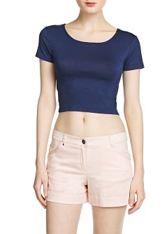 Camiseta cropped en tejido elástico con cuello redondo y manga corta.