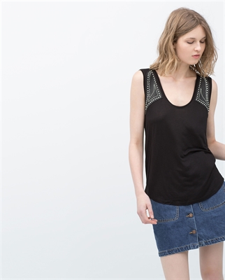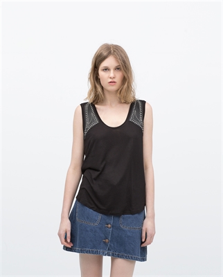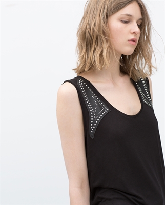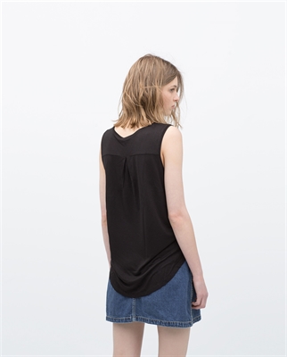 camiseta fluida. Detalle polipiel. Cuello escote. ALTURA MODELO: 178 CM