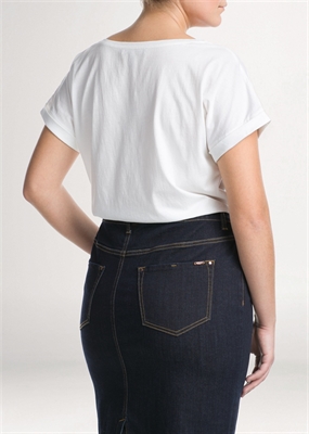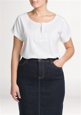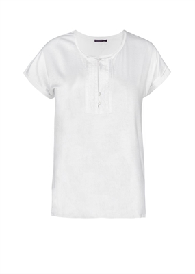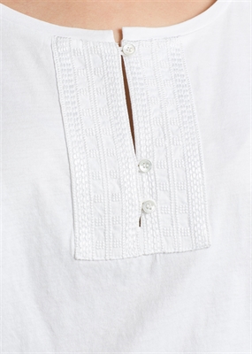 Camiseta de algodón con detalles bordados. Cuello redondo y cierre de botones en la parte delantera. Manga corta con vuelta y bajo asimétrico con aberturas laterales.