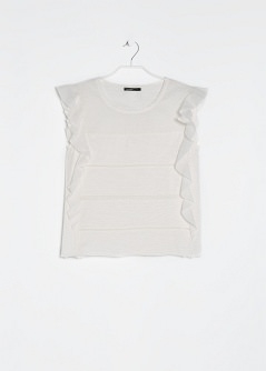 Camiseta sin mangas en algodón flamé con volantes decorativos y ribetes de crochet. Cuello redondo, panel bordado en la parte superior y costuras abiertas.