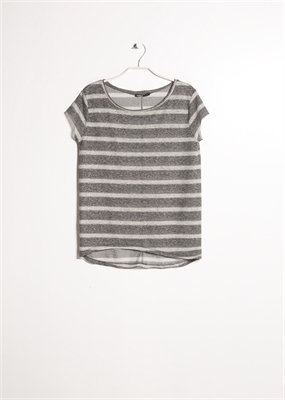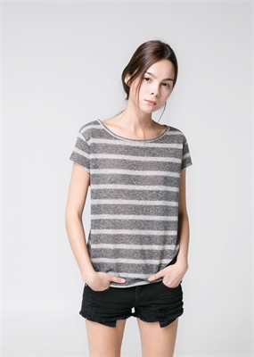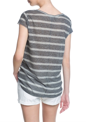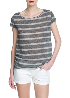 Camiseta de rayas confeccionada en una mezcla de lino. Cuello redondo, manga corta con costuras abiertas y bajo asimétrico.