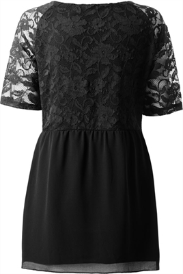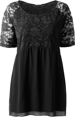 Camiseta de mangas cortas en modal con panel en georgette y canesú de encaje con escote amplio. Posee una caída suave.