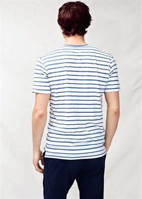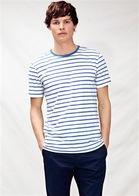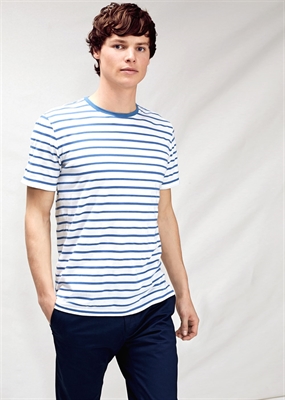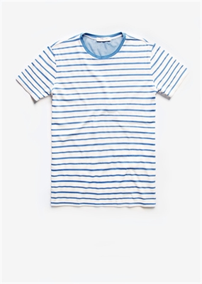 Camiseta de rayas confeccionada en algodón con textura que pertenece a la línea casual. Cuello redondo, manga corta y aberturas laterales en el bajo.