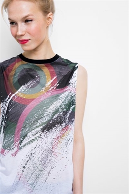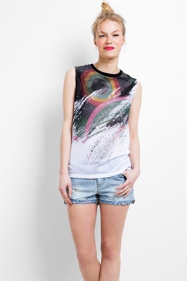 Un top sin mangas que sigue el ritmo de la música, ¡y el tuyo! Es blanco, fresco, fit regular y derrocha actitud. Live forever!