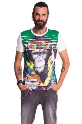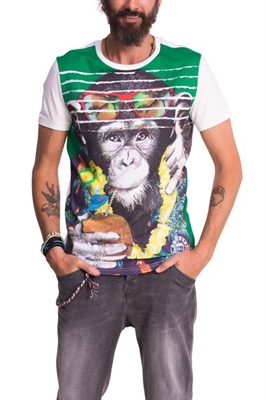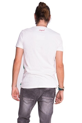 Esta temporada no te quedes sin una camiseta 100% cachonda. Esta es verde y blanca con un colega muy especial. Además, tiene rayas horizontales con el efecto rasgado tan Desigual. ¡Aloha!