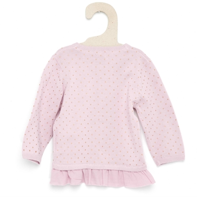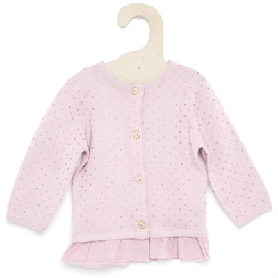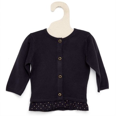Perfecta para llevarla con un vestido en las noches frescas de verano. - Chaqueta de punto fino - Manga larga - Cuello redondo - Cierre abotonado - Volantes de gasa de algodón en el bajo - Motivo de lunares - Algodón puroENCIMA 100% algodon MATERIA 2 100% algodonSe puede lavar a máquina.