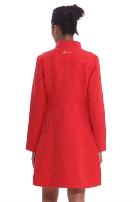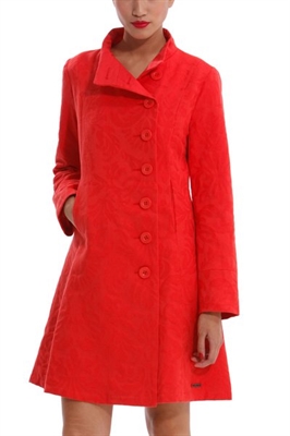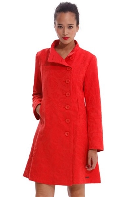 Abrigo de mujer Desigual modelo Elisabeth, completamente liso con un estampado de Jacquard que recubre toda la prenda. El bajo es ligeramente acampanado y tiene bolsillos laterales.