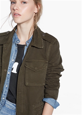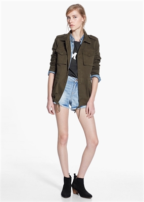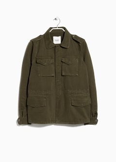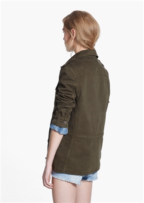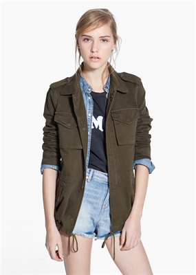 Chaqueta de estilo militar confeccionado en algodón. Trabillas en los hombros y puños, cierre oculto de cremallera y botones a presión en la parte delantera. Dos bolsillos de parche en el pecho, dos bolsillos abotonados de solapa, cordón interior ajustable a la cintura y manga larga.