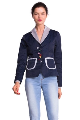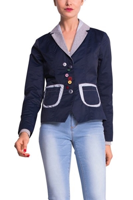 Este blazer azul marino es elegante pero tiene detalles divertidos que le dan un toque único. Nos encantan los botones de colores y los bordados y patchs en la espalda. ¡Tu estilo casual es ahora happy casual!