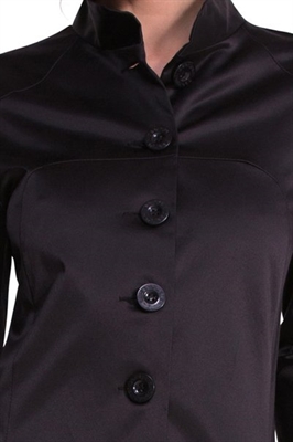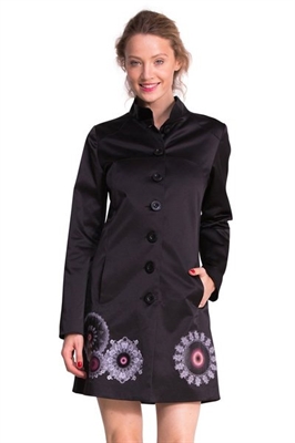Un abrigo de verano que te será muy cómodo para los días más frescos. Es negro satinado con costuras que te estilizarán la figura. Tiene bolsillos interiores y adornos galactic en el bajo que le dan el toque de color.