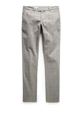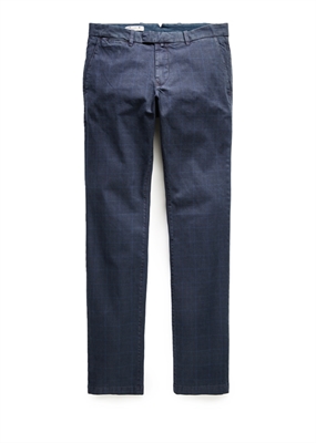 Chino de Príncipe de Gales en una mezcla de algodón que pertenece a la línea casual. Dos bolsillos laterales, bolsillo portamonedas y dos bolsillos de ribete con botón en la parte posterior. Trabillas, cierre de cremallera y botón.