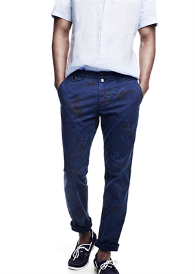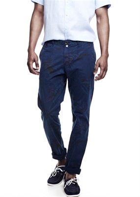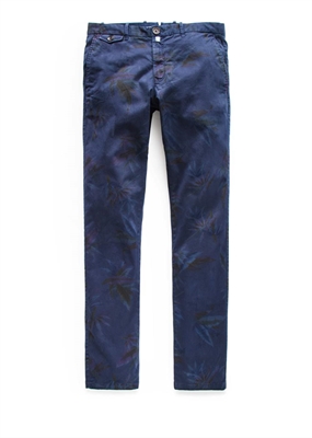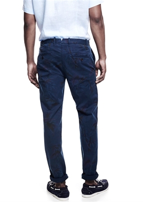 Chino slim-fit en algodón garment-dyed con estampado tropical que pertenece a la línea casual. Dos bolsillos laterales, bolsillo portamonedas y dos bolsillos traseros de ribete con botón en la parte posterior. Trabillas, cierre de cremallera y botón.