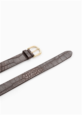 Cinturón de piel con acabado de cocodrilo. Trabilla y cierre de hebilla metálica.