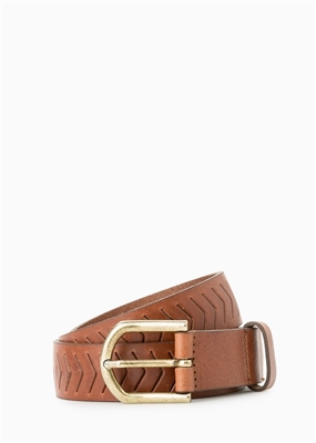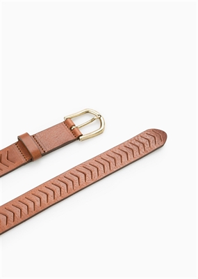 Cinturón de piel con diseño perforado de espiga. Trabilla y cierre de hebilla metálica.